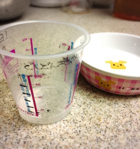 - お皿を舐め続けたときは足りていないという訴え。カップの印をみてひとメモリずつ増やしていく